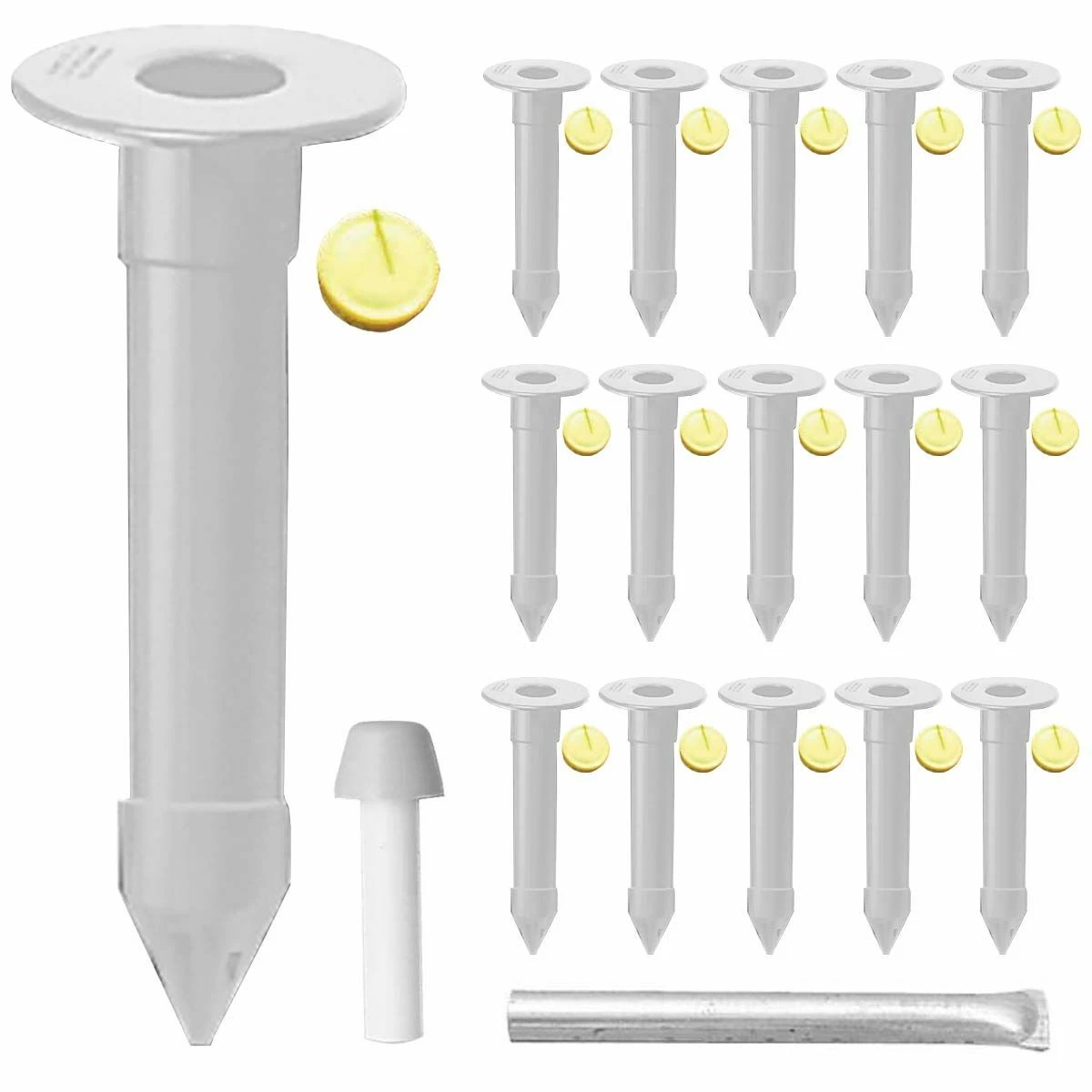- Includes 16 12″ ground sockets, 16 yellow plugs, a socket setter and a pilot hole tool