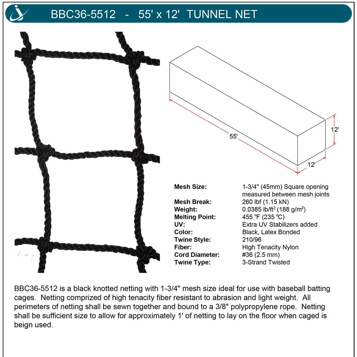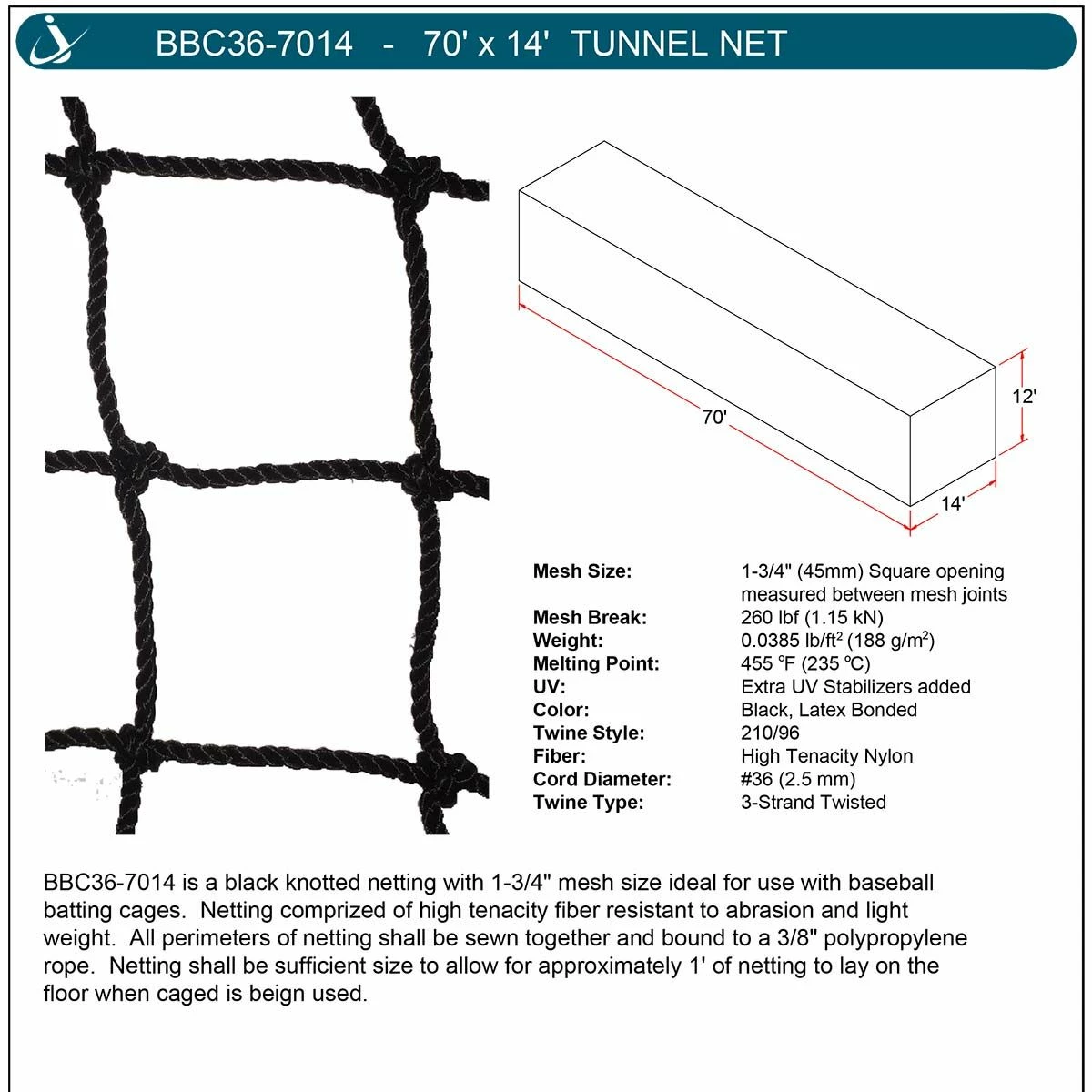 Let your hitters take their cuts safely in the cage with Jaypro’s All Star batting tunnel net. The All Star net is constructed of #36 thread count, 1-3/4″ square nylon mesh that is twisted and knotted for extra durability. The perimeters of the net are sewn together and bound to a 3/8″ polypropylene rope to prevent fraying. This lightweight, yet durable mesh net is comprised of high tenacity nylon fibers that are resistant to abrasion. The net’s extra UV stabilizers prevent fading from the sun. This batting tunnel net is sized large enough to allow approximately 1 foot of netting to lay on the ground when the cage is in use.