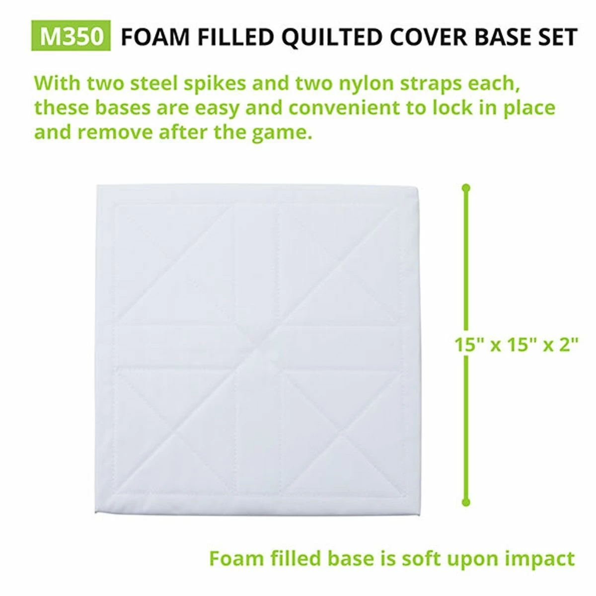 Complete your baseball diamond with this set of 3, foam-filled economy bases. The heavy-duty nylon straps and steel spikes secure each base to the ground. The cushy foam filling and quilted cover prevent injuries when athletes slide to base.