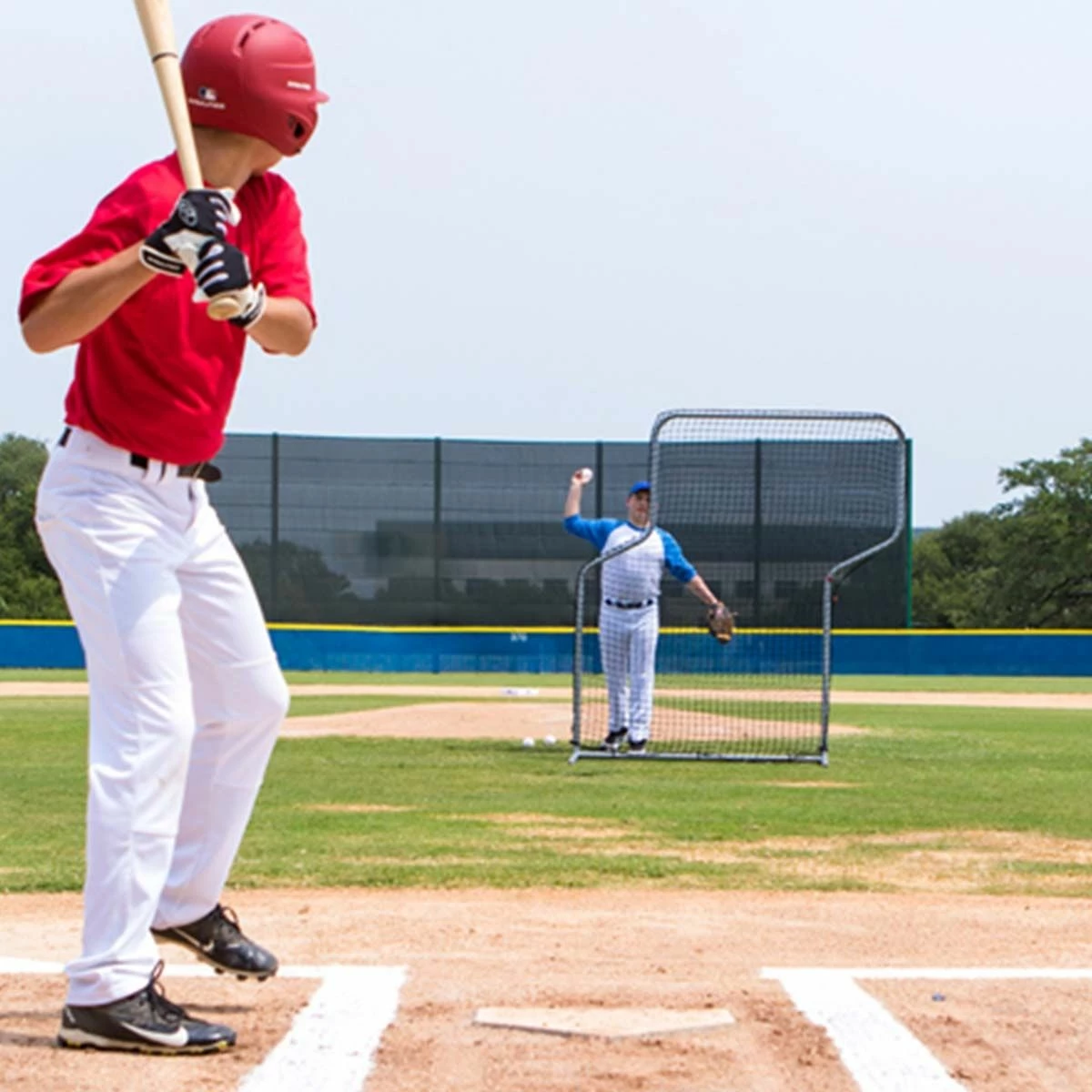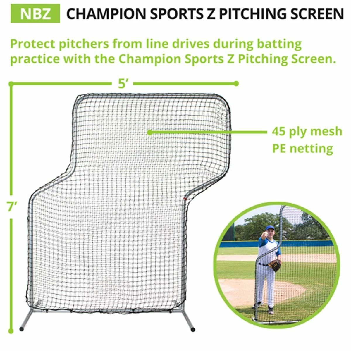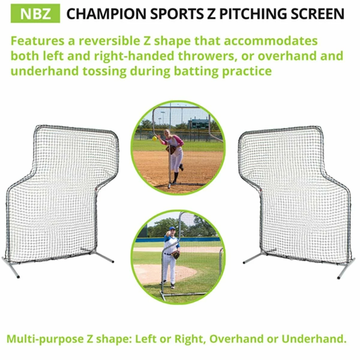 The Champion softball / baseball Z screen protects pitchers from line drives during batting practice. This pitching protective screen has a reversible “Z” shape to allow left and right-handed throwers for both overhand and underhand throwing. The Z screen protector has a 45-ply mesh PE netting that will stand up to heavy use and is 5’W x 7’H.