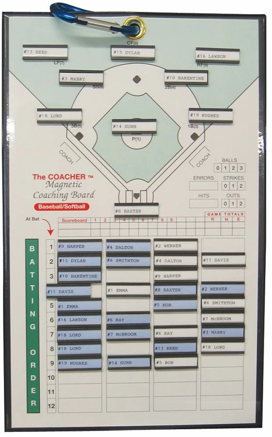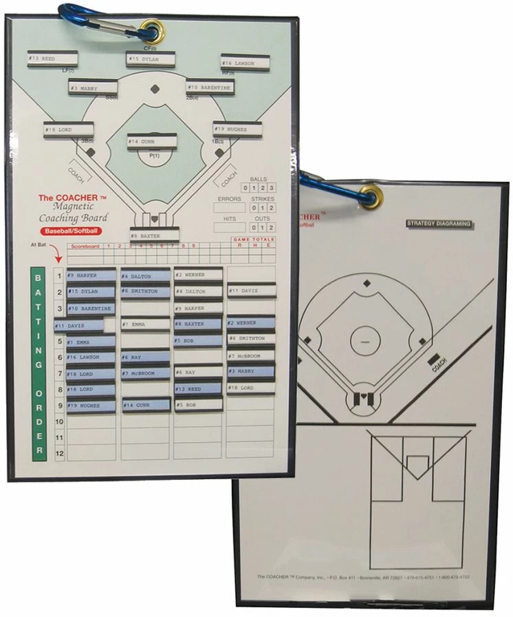 This magnetic coaching board keeps track of player’s positions, actions and statistics and makes it easy for coaches to change batting orders and fielding instantly and graphically. The opposite side is a whiteboard so you can diagram strategy.