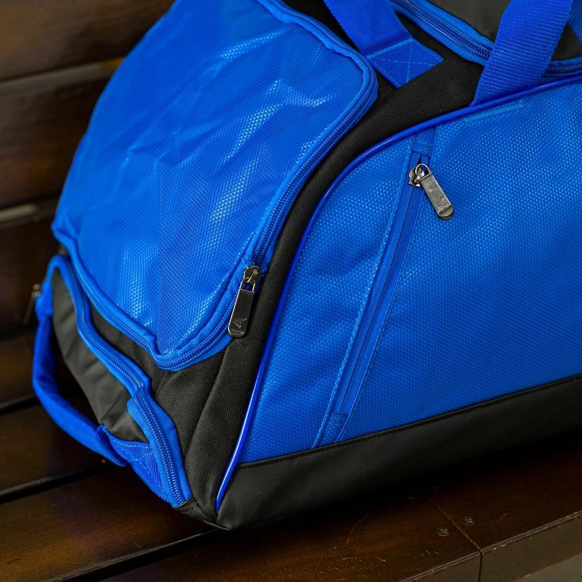 The Easton Dugout is a durable wheeled equipment bag that is perfect for any player and their gear. A hard one-piece molded base provides stability and durability to the bottom of the bag. The padded bat compartment that can store and protect up to 5 bats, and an oversized large-mouth opening with YKK zippers provides easy access into the main bag compartment. Roll up to games or practices through any terrain with the rugged inline wheels of the Dugout Wheeled bag.