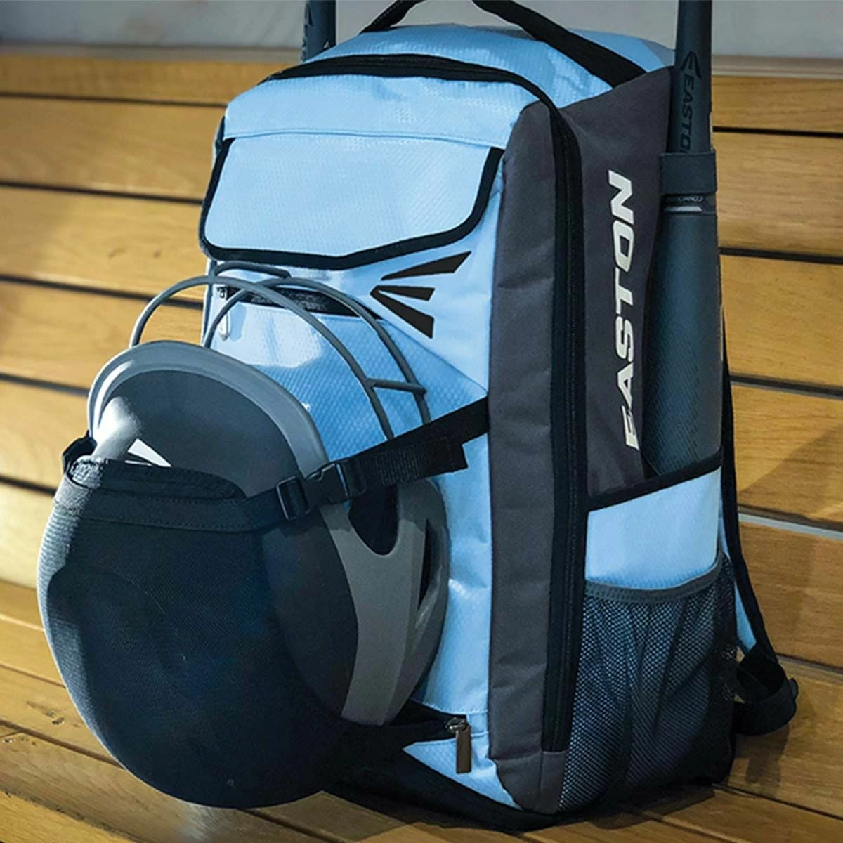 The Easton Ghost fastpitch backpack, 20″H x 14″W x 9.5″D, includes two bat sleeves to specifically fit 2 1/4″ softball bats, providing protection for your bats. The backpack also features a personal mirror protected by a flap for applying face products or adjusting your visor, headband, or bow. The versatile backpack includes a hidden external helmet holder that can be stowed away when not in use, a vented shoe compartment, and a felt-lined pocket for your personal items on the top of the bag underneath the mirror flap. The Ghost fastpitch backpack includes female specific padded back and shoulder straps for extra comfort, as well as an external fence hook for dugout functionality. Customize your backpack in the space allowed for a team embroidery on the front pocket of this very unique backpack!