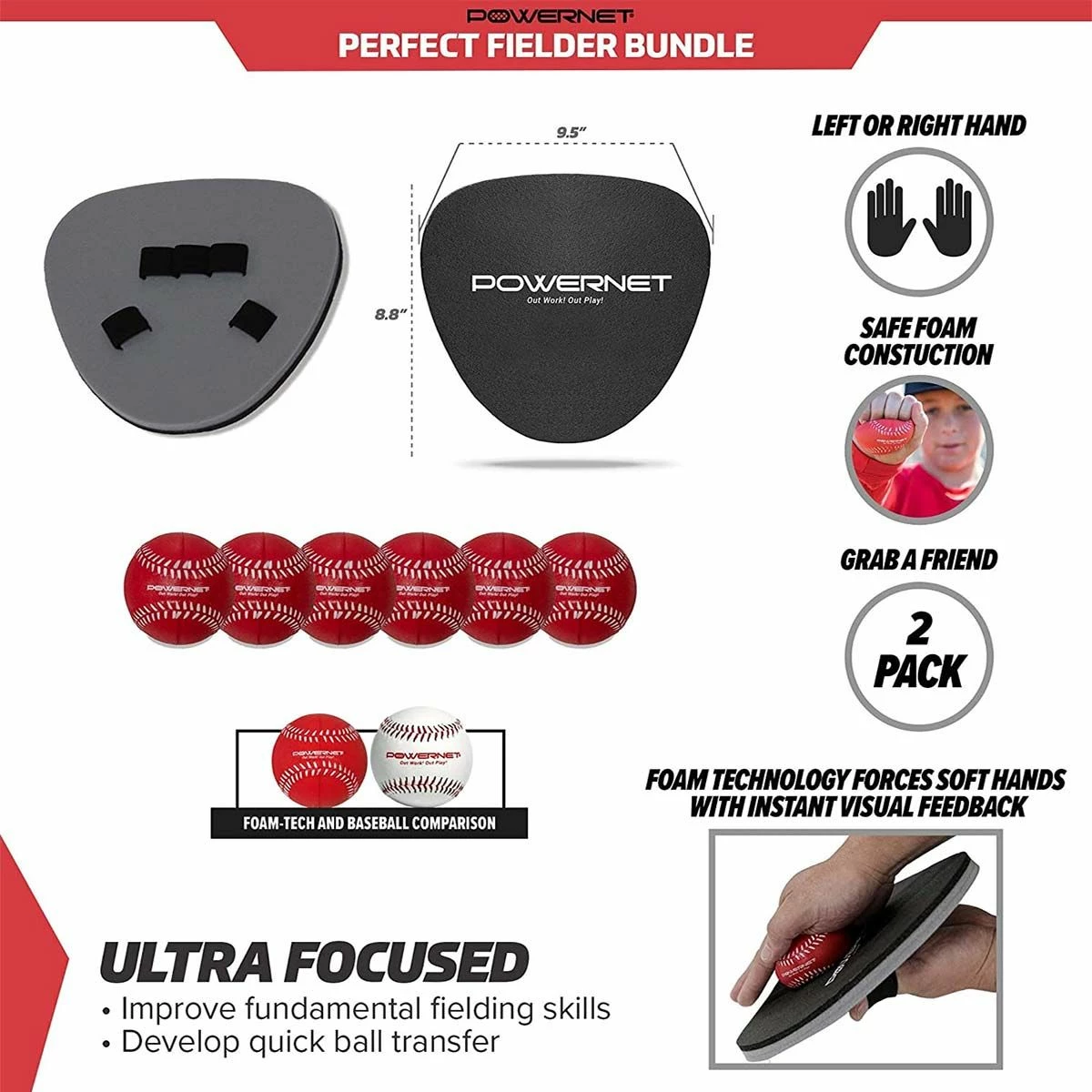 Improve your fielding fundamentals with the perfect fielder and foam tech ball bundle. This set includes 2 perfect fielder trainers and 6 foam tech training balls that are baseball sized to simulate realistic fielding situations. The flat, pancake surface of the perfect fielder forces the athlete to trap the ball for better transfer. The foam tech utility balls will not break like plastic balls and feature a soft, squeezable design that regains its shape after being hit. Great for training solo against a wall or with a partner where each player wears one of the perfect fielders to practice quick reactions. This training bundle teaches how to have soft hands for fielding ground balls and helps improve glove to hand transition. This is an effective fielding training aid for all positions including catcher.