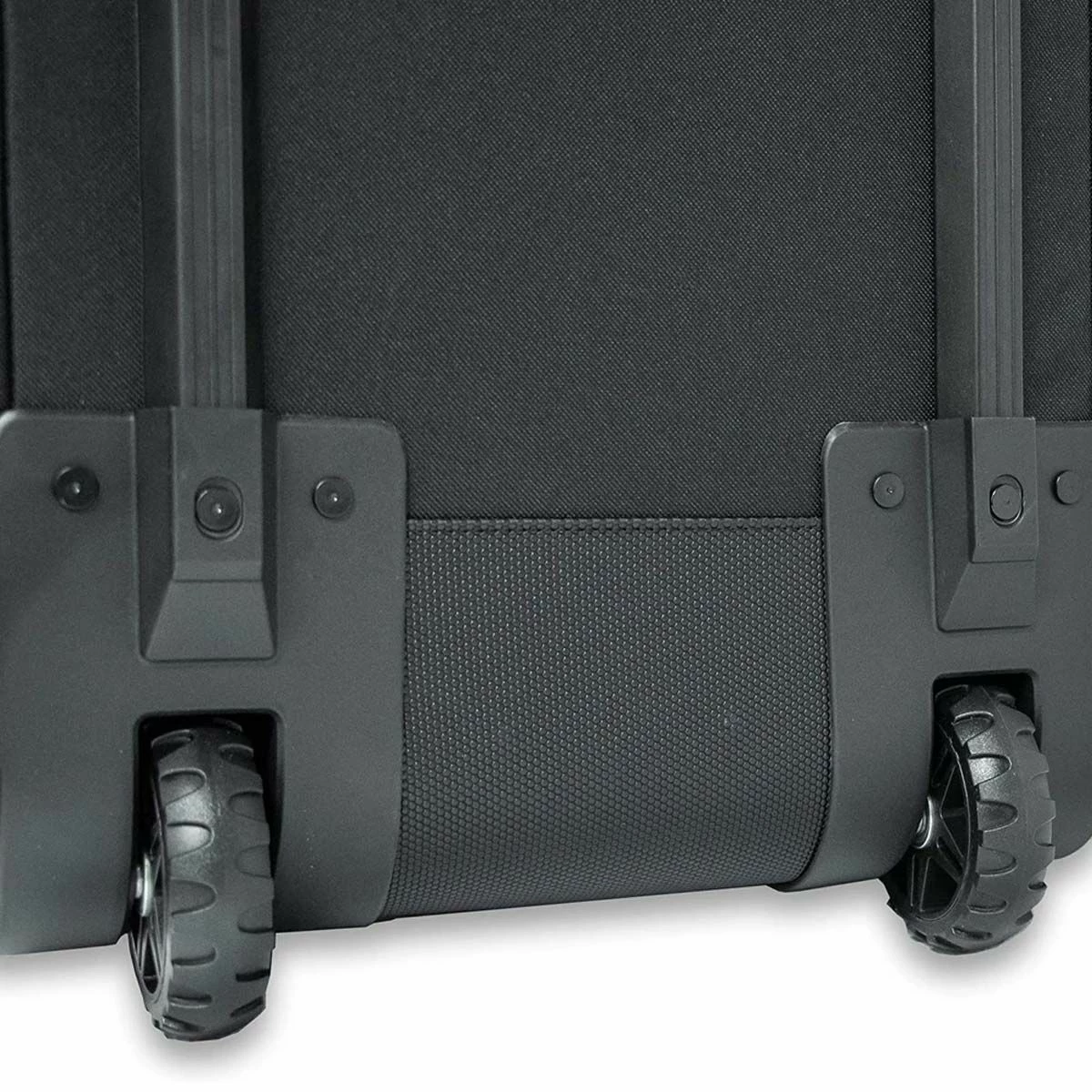 Coaches, get organized for the game or practice with the rolling baseball/softball ball bucket caddy. This wheeled equipment bag features a dual main compartment with a divided area that can fit up to two 6 gallon baseball/softball buckets or a combination of coaching equipment including batting helmets and gloves. Remove the inner divider in main compartment to carry your largest items. This versatile bag also includes 10 pockets for storage and organization, including a zippered, felt-lined valuables pocket to keep your cell phone and other devices scratch-free. Wheel the bag anywhere, even straignt to the pitcher’s mound, thanks to the convenient telescoping handle and durable all-terrain wheels. The ball bucket caddy is fortified with a molded, durable plastic surrounds the wheels and bottom of the bag. The bag material is a heavy-duty fabric that is resistant to wear and tear. Two rails run along the bottom to stabilize the bag and minimize damage when set on the ground.