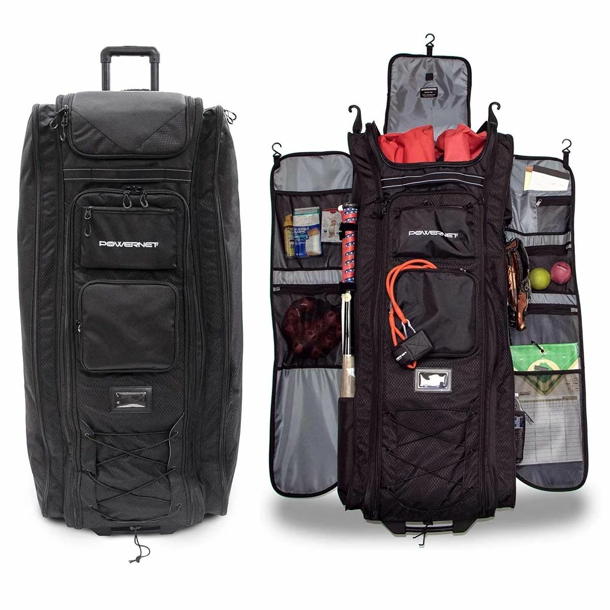 The Powernet rolling equipment bag is the ultimate all-in-one team travel bag for any baseball or softball coach. Measuring 46″H x 20″W x 15″D, this bag features a massive main compartment that easily fits up to four 7×7 style net carry bags or a combination of coaching equipment including shin guards and catchers gear. Keep one slot open to store multiple batting helmets or fielding gloves. The bag’s divider can be removed to create one large space for carrying your biggest items. This coaches bag is equipped with over 20 organization pockets and hooks to store everything from a coaching clipboard to a first aid kit. There’s a zippered, felt-lined valuables pocket to keep your cell phone and other devices scratch-free. Keep three full-size bats secured on the side bat panel pocket that features barrel sleeves and hook and loop latches. The bag’s durable fence hanging hooks allows you to keep the flaps open for easy access to all of your equipment. A hidden telescoping pull handle and durable large all terrain wheels make travel over asphalt, dirt or grass a breeze. Load the bag into your car with ease thanks to grab handles at several locations along the top, bottom, front and back. This wheeled equipment bag is reinforced with molded, durable plastic that surrounds the bottom side along with heavy-duty fabric that is resistant to wear and tear. Support rails are implemented on the back of the bag to prevent tearing.