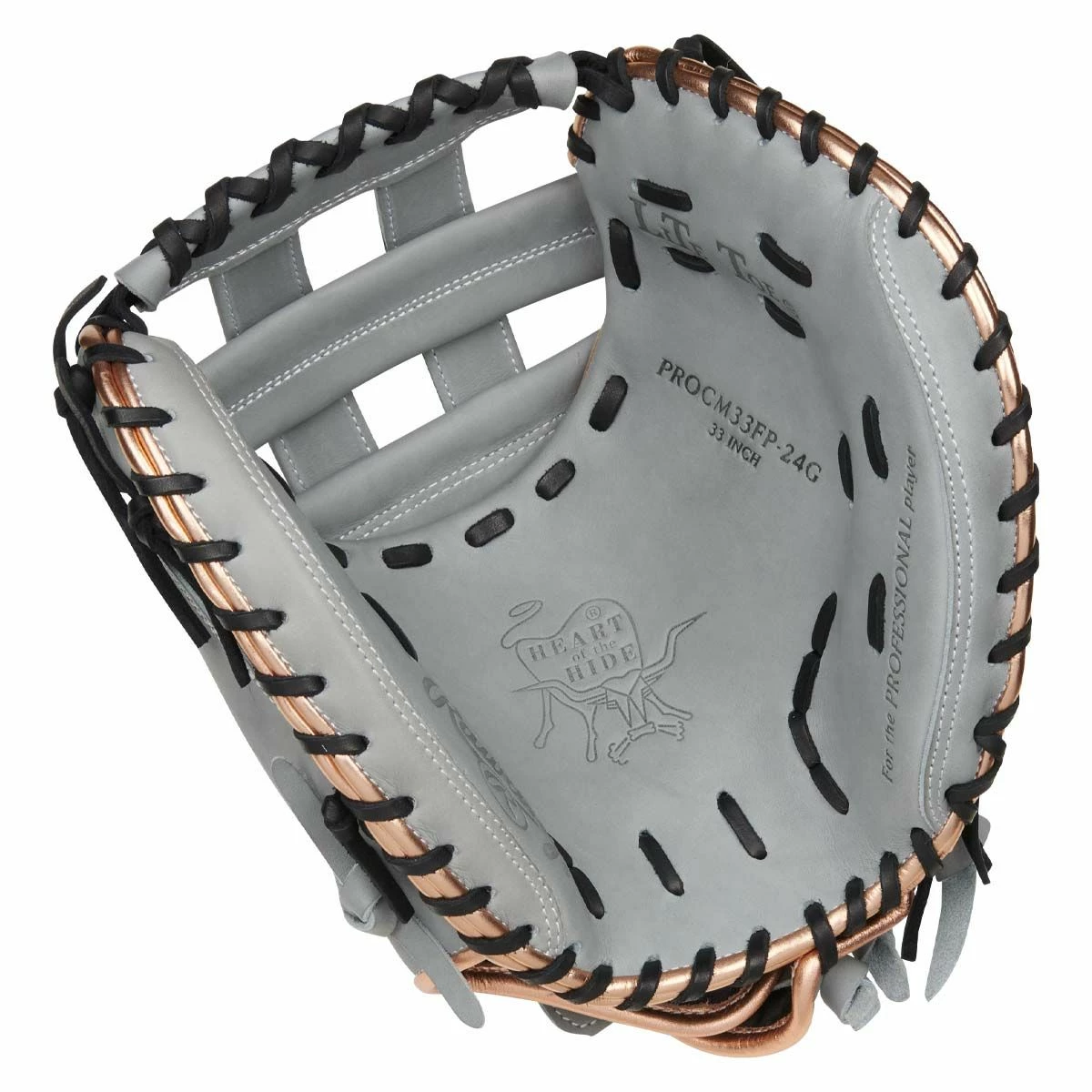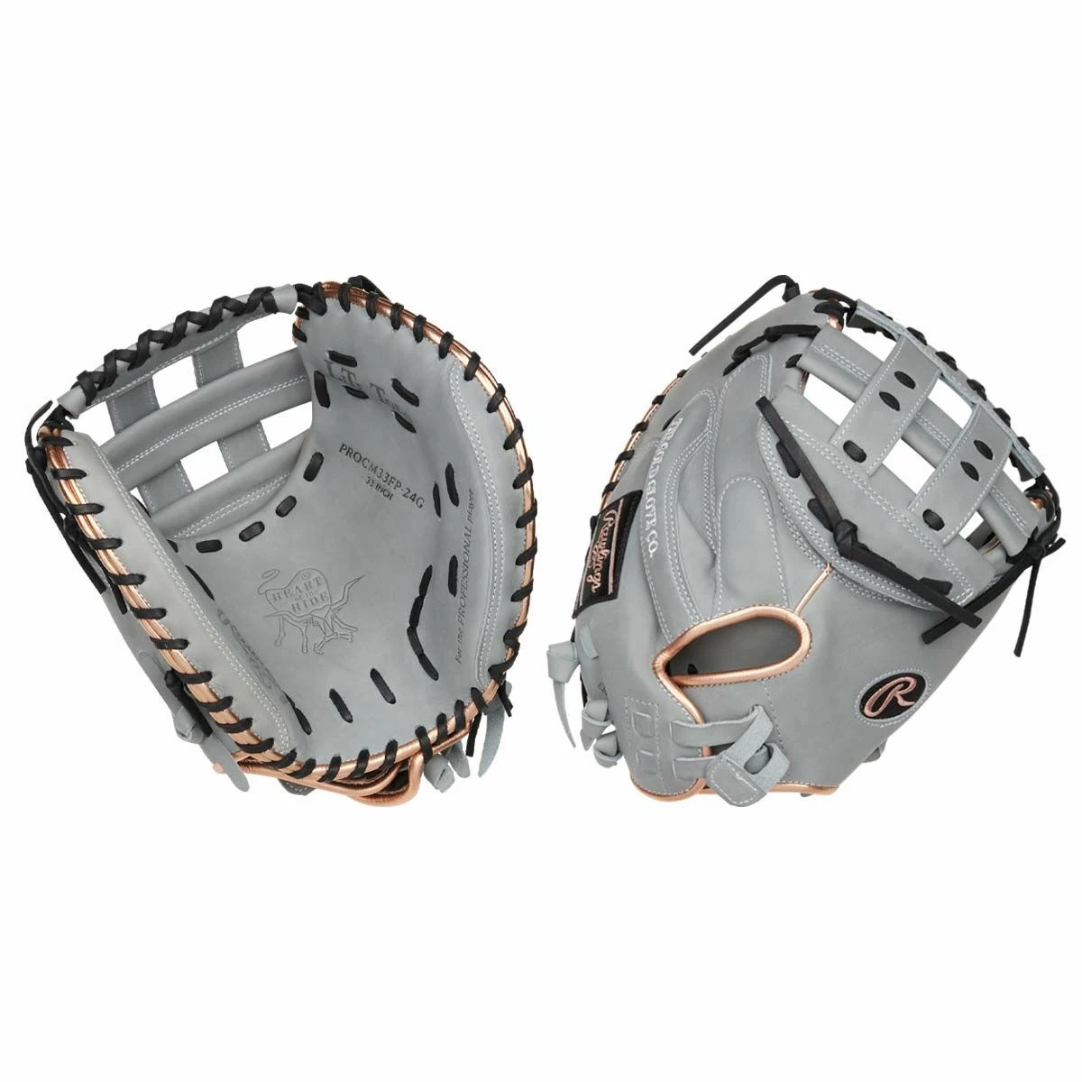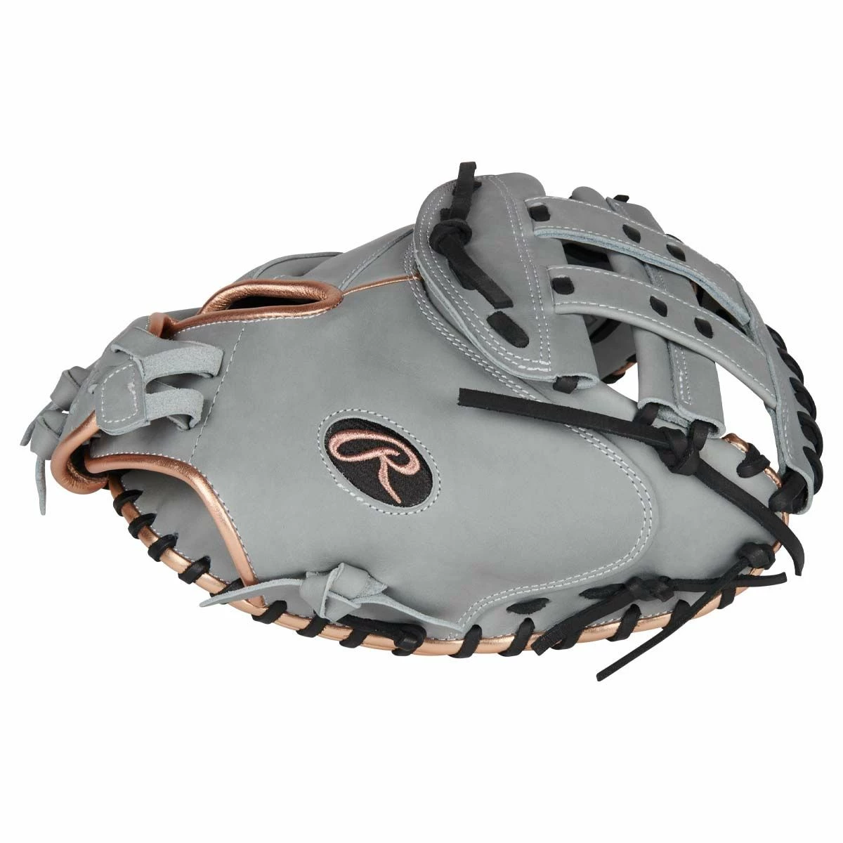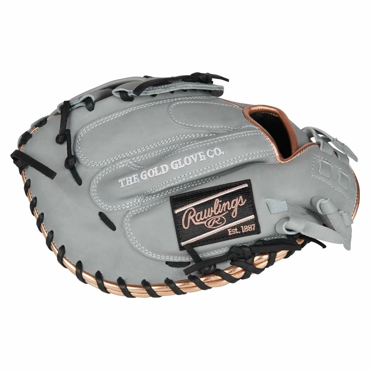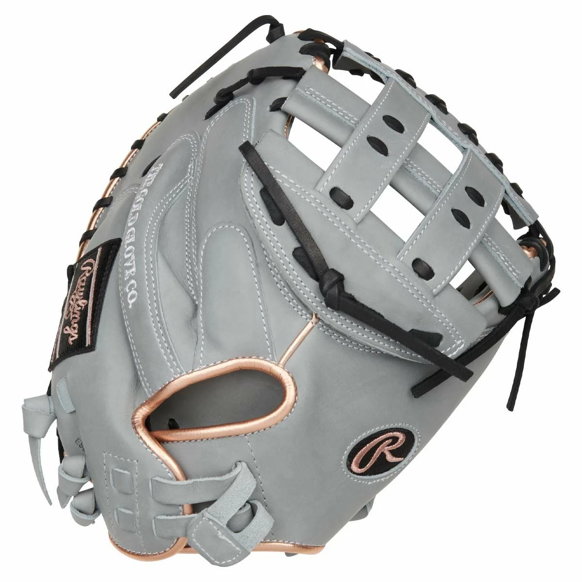 The Rawlings PROCM33FP-24G fastpitch softball catcher’s mitt is built with Rawlings’ world-renowned Heart of the Hide steer hide leather and is used by the top players in the game. With a versatile Modified Pro H® Web design, this catcher’s mitt is effortless to break in for an immediate game-ready feel. The 33″ mitt sports a gray color and pull-strap closures for an improved fit. This Rawlings model boasts full-grain leather for increased durability and a padded thumb sleeve for extra comfort. This mitt is perfect for fastpitch softball catcher’s competing at the game’s highest levels who are seeking the best control over all kinds of pitches thrown their way.