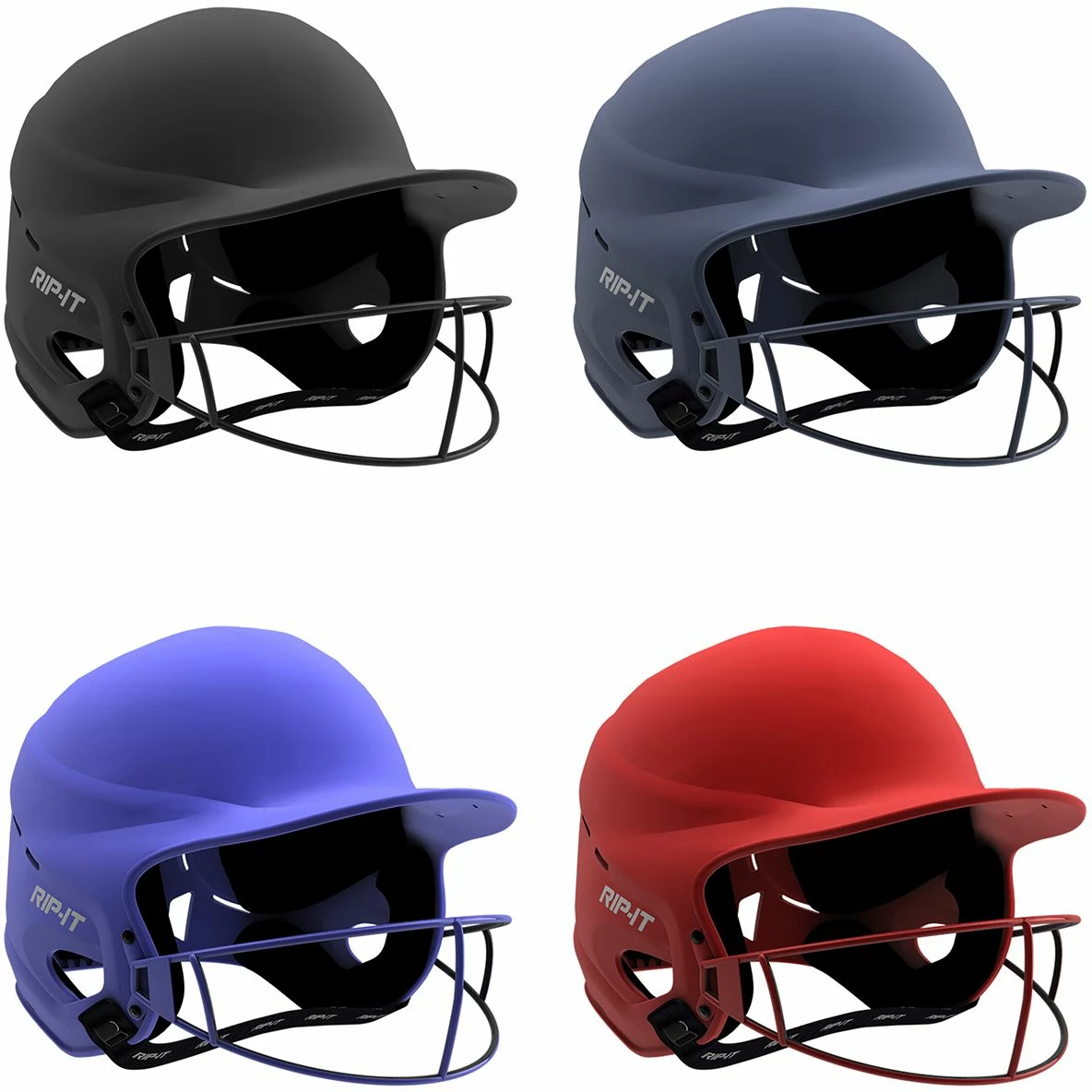 Rip-It fastpitch matte batting helmets feature cutting edge Blackout Technology that eliminates 100% of the glare coming off the face mask due to the special coating on the bars. The face mask offers the best vision of any fastpitch batting helmet because of the exclusive panoramic design, which increases vision by eliminating bars that can affect peripheral sight. 21 air vents and moisture management wrapped pads help keep the player cool and dry.